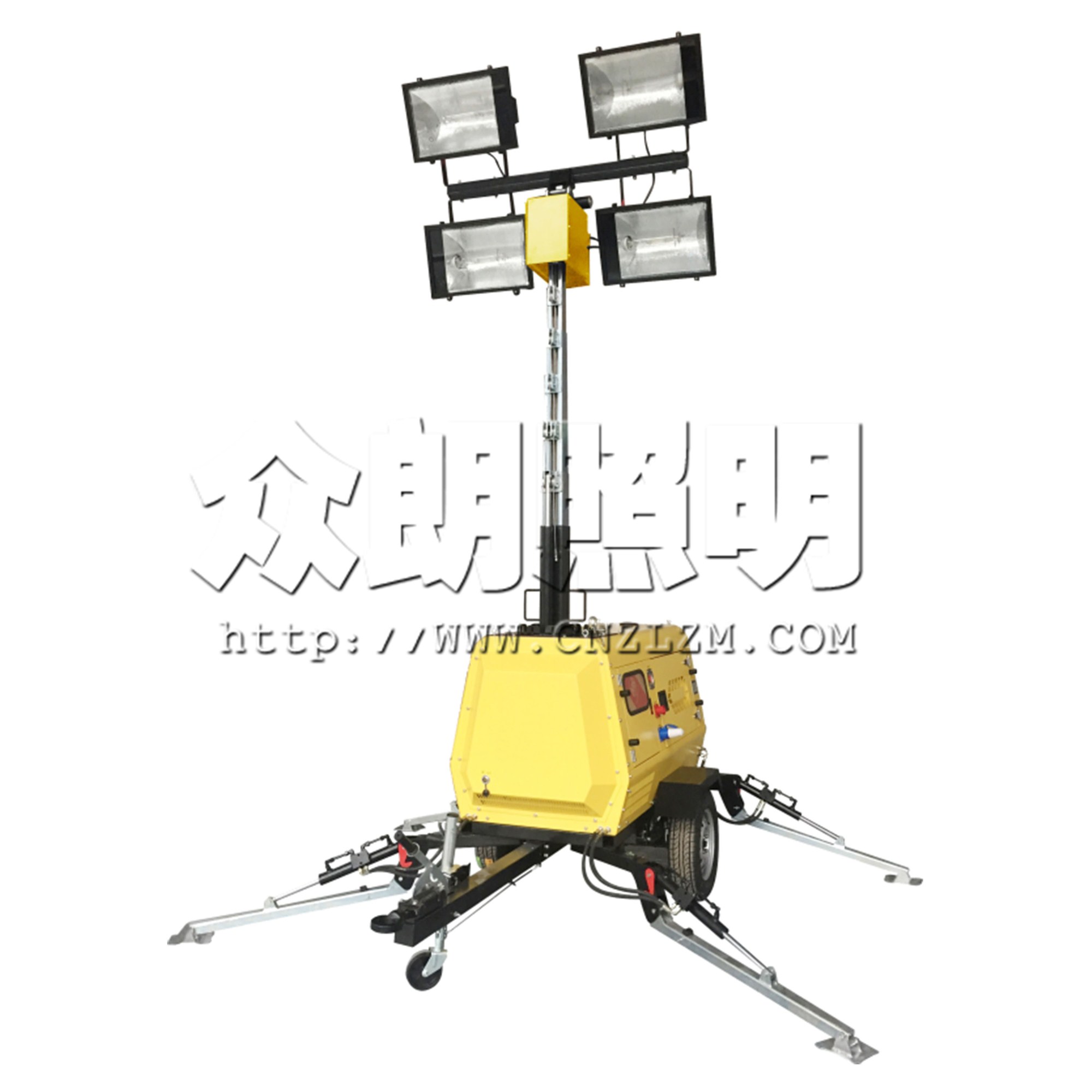 采用4盞1000瓦金鹵燈,燈桿升起10米后,燈光覆蓋半徑可達120~150米。整體照明遠近兼顧,照明距離遠,照射面積大。